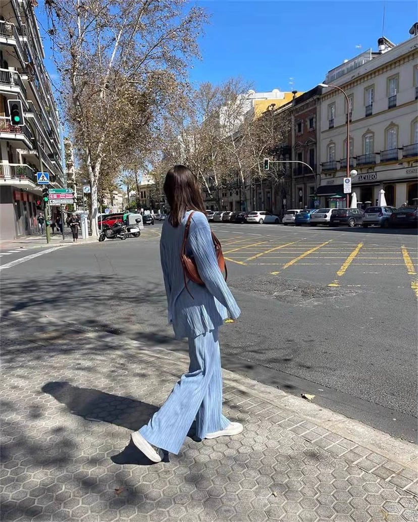 この上下セットは、爽やかなストレートパンツと長袖シャツのツーピーストップスが組み合わさっており、シンプルながらも個性的なスタイルを演出します。施されたギャザーのディテールが大人可愛い印象を与え、リラックスした雰囲気の中にもセクシーさと色気を与えます。