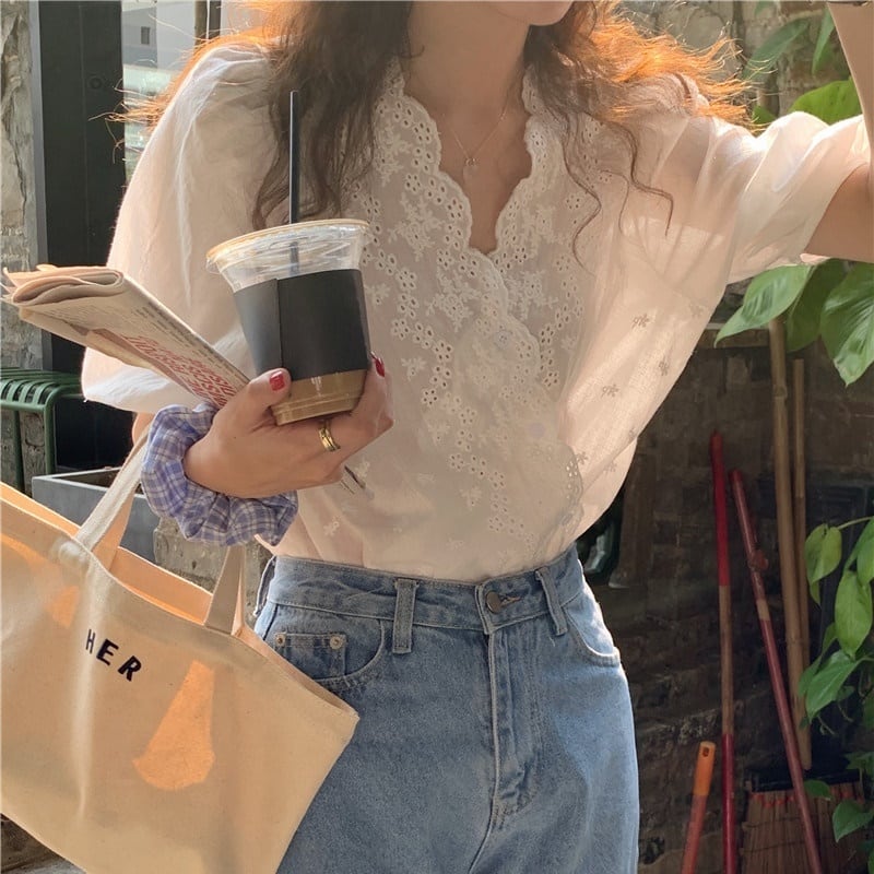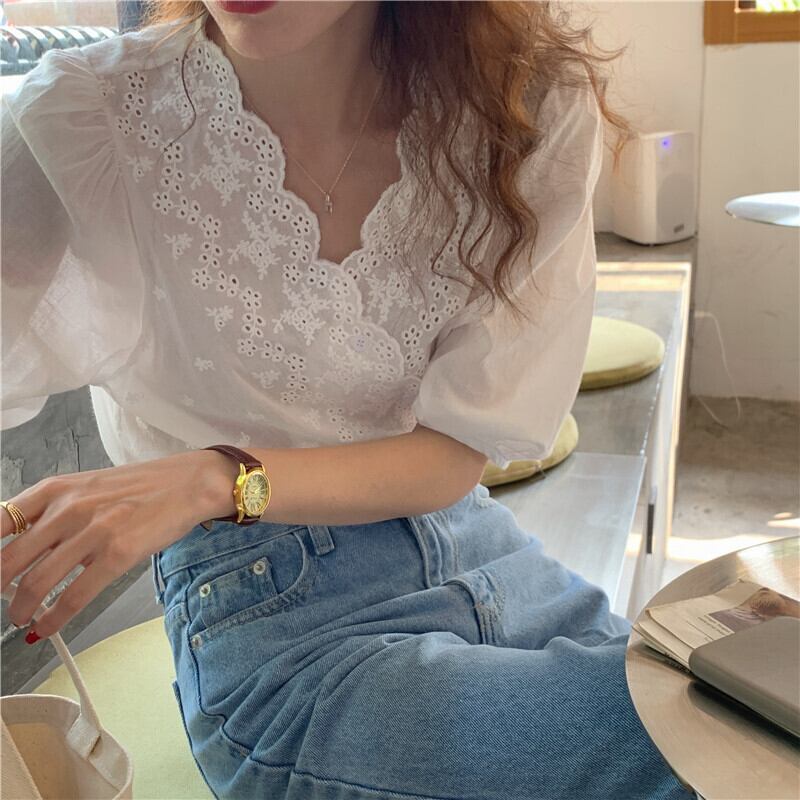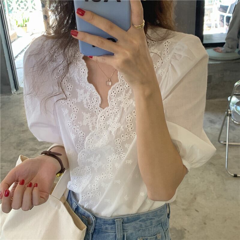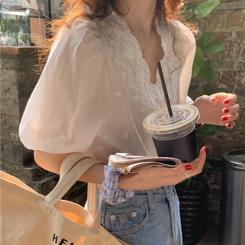 レディース トップス シャツ ブラウス 半袖 ボリューム袖 Vネック フェミニン 透け感 シースルー かわいい 大人可愛い シンプル カジュアル レトロ こなれ感 ガーリー クール ラブリー キュート 学生風 ナチュラル 涼しげ デート お出かけ お泊まり 旅行 レストラン ショッピング コンサート ライブ コンパ カフェ アースカラー ランチ 韓国 オルチャン 楽ちん 普段使い 着回し モテ 清楚 トレンド 流行 インスタ映え 定番 フリーサイズ ワンサイズ ホワイト ベーシックカラー 大人カラー