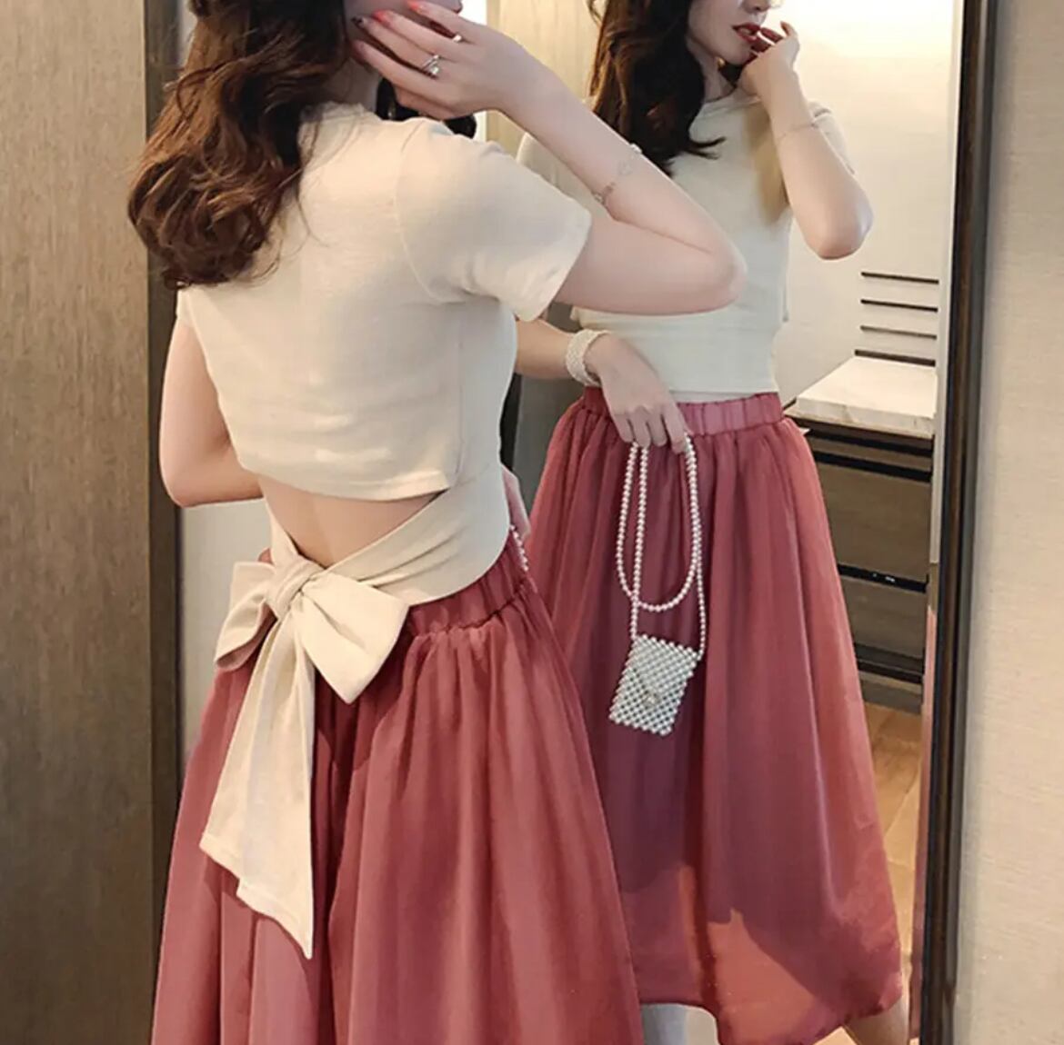大人可愛いデザインのフレア Aラインスカートと、5分袖のクルーネックTシャツがセットに。 バックリボンデザインがポイントで、シンプルでありながら存在感のあるスタイルを演出します。