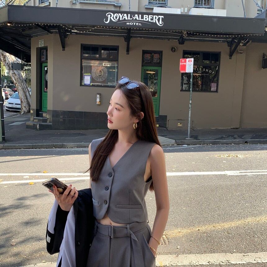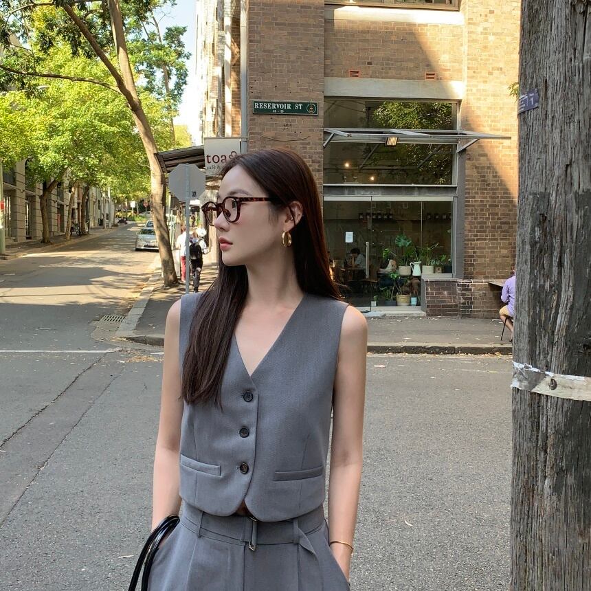ベスト クロップド レディース トップス ノースリーブ Vネック ポケット 前開き ボタン 大人可愛い きれいめ シンプル 上品 おしゃれ かっこいい こなれ感 クール モード系 エレガント モダン フォーマル とろみ感 抜け感 都会的 ラグジュアリー クラシカル ベーシック ナチュラル シック アンニュイ 無地 会議 MTG オフィス ビジネス OL 通勤 デート お出かけ パーティー イベント レストラン ショッピング 韓国 オルチャン モテ インスタ映え フリーサイズ ワンサイズ グレー ベージュ