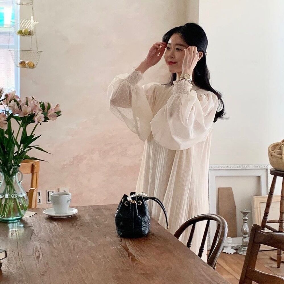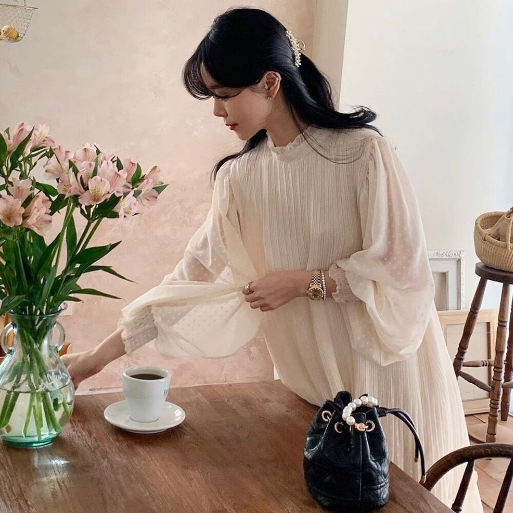 レディース ワンピース ロング 長袖 ボリューム袖 ハイネック フレア フェミニン プリーツ ふわふわ 透け感 シースルー かわいい 大人可愛い きれいめ シンプル 上品 おしゃれ こなれ感 ガーリー 抜け感 キュート カントリー ナチュラル ドット柄 水玉 デート お出かけ 旅行 レストラン 女子会 休日 コンサート 韓国 オルチャン 楽ちん 体型カバー 美脚 脚長 普段使い 着回し モテ インスタ映え ゆったり ゆる フリーサイズ ワンサイズ ホワイト ベーシックカラー 大人カラー 春カラー 秋カラー