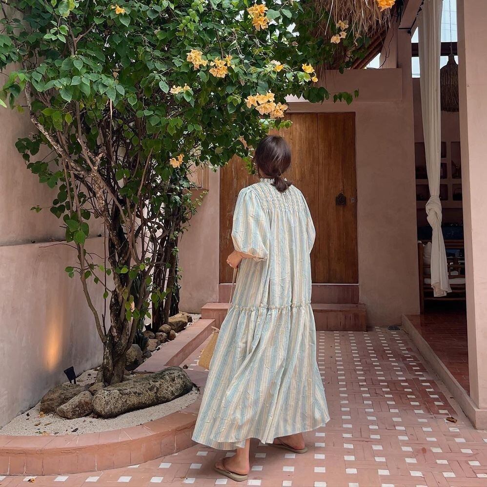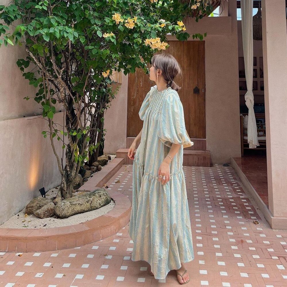 レディース ワンピース ロング 5分袖 フレア フェミニン かわいい 大人可愛い シンプル カジュアル おしゃれ レトロ こなれ感 ラフ 抜け感 キュート ナチュラル 清潔感 リラックス 軽やか ママ マタニティ デート お出かけ リゾート 旅行 レストラン 女子会 休日 バカンス ホテル ガーデン ショッピング コンサート ライブ コンパ カフェ ランチ 韓国 オルチャン コーデ 楽ちん 普段使い 着回し トレンド 流行 インスタ映え ゆったり フリーサイズ ワンサイズ グリーン 大人カラー パープル