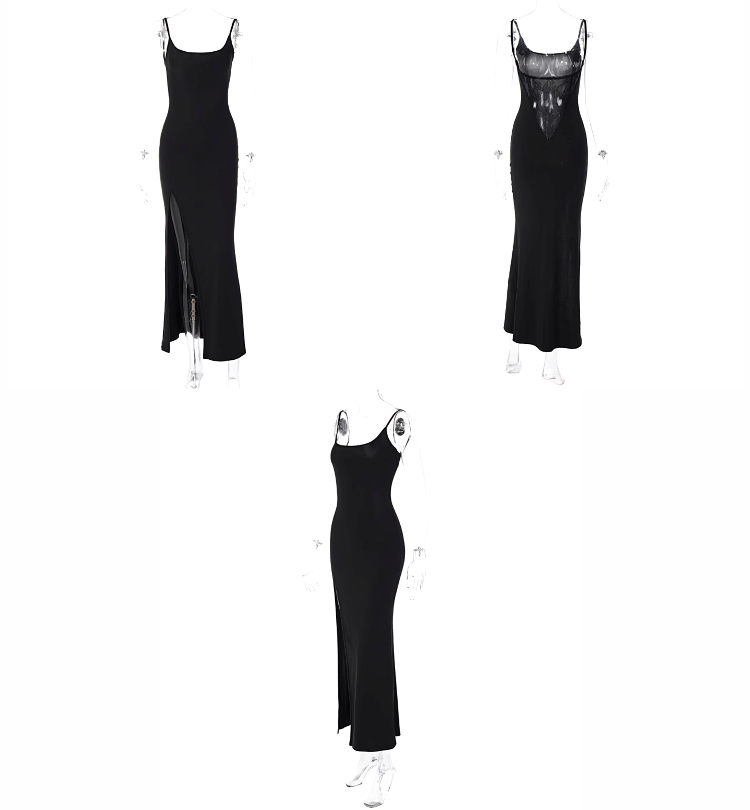 マキシ丈のキャミドレスは、スパゲッティストラップとヌードバックのデザインが肌見せのバランスを美しく演出。タイトなシルエットと深いサイドスリットが美脚効果を高め、華やかでセクシーな印象に。花柄のシアーレースがバックコンシャスな魅力を添え、シンプルながらもエキゾチックでモダンな雰囲気を醸します。伸縮性のある素材で着心地も快適。春夏のパーティーやホテルイベントにふさわしい、シックで色気のある一着です。