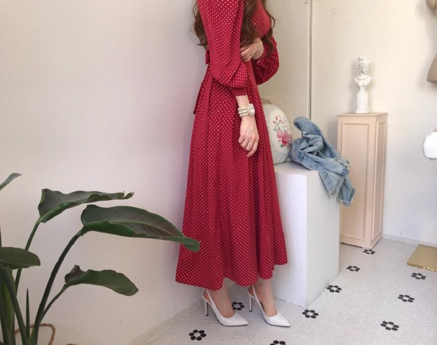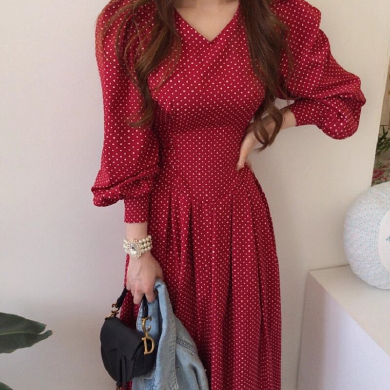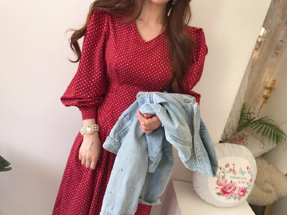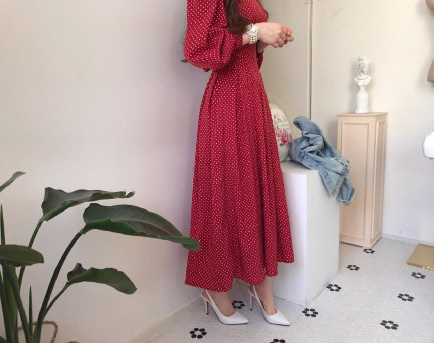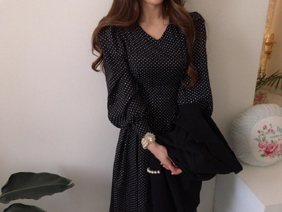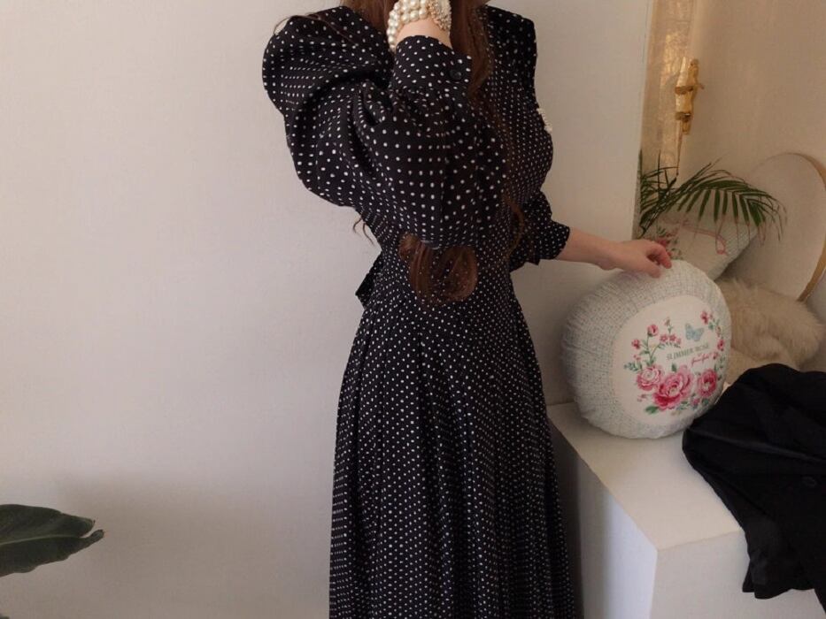 フレアデザインとボリューム袖が魅力的なこのロングワンピースは、Vネックとノーカラーでフェミニンな印象を与えつつ、シンプルかつ上品な仕上がりです。ドット柄がシックでアンニュイな雰囲気を漂わせ、さまざまなシーンでおしゃれを楽しめる一着です。