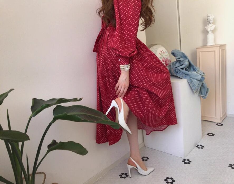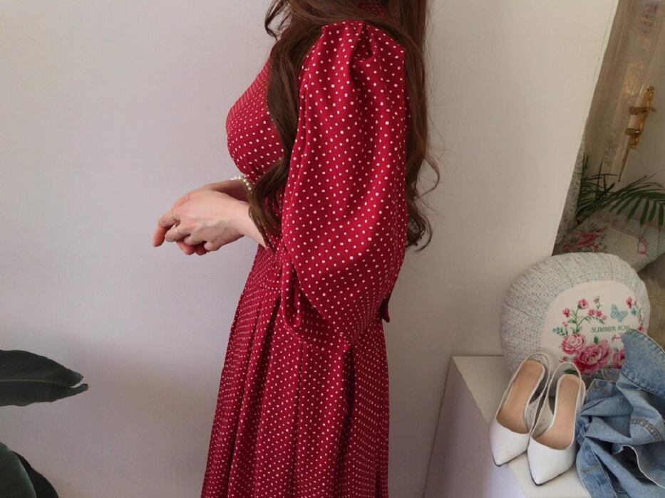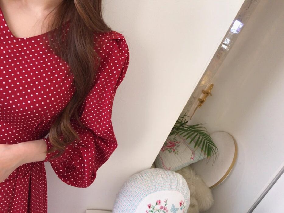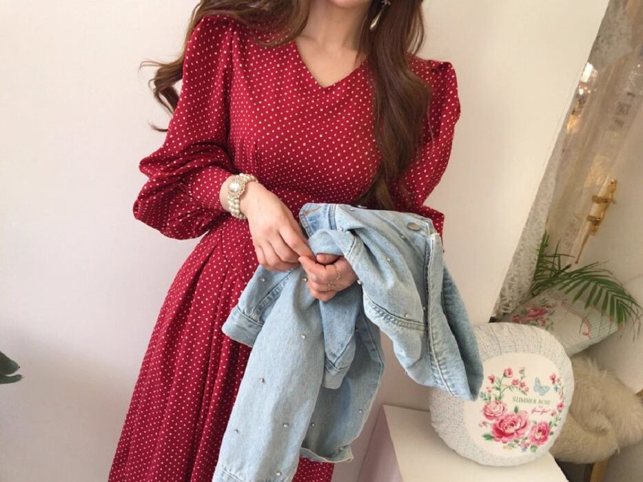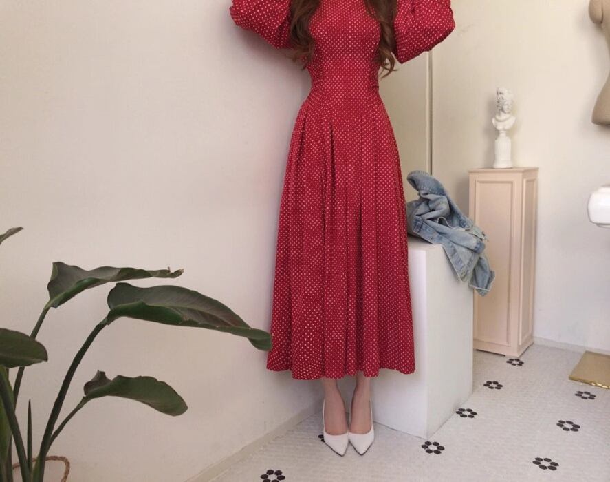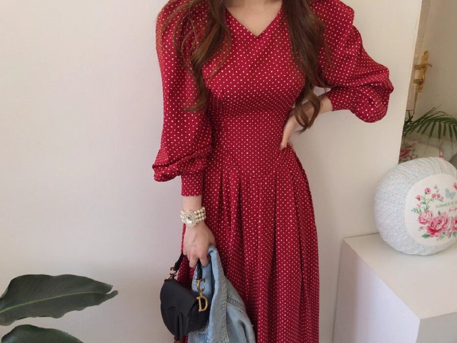 フレアデザインとボリューム袖が魅力的なこのロングワンピースは、Vネックとノーカラーでフェミニンな印象を与えつつ、シンプルかつ上品な仕上がりです。ドット柄がシックでアンニュイな雰囲気を漂わせ、さまざまなシーンでおしゃれを楽しめる一着です。
