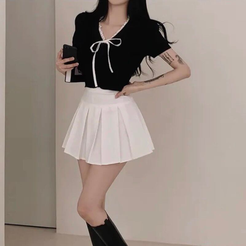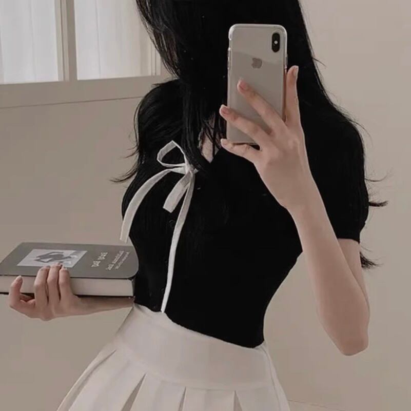 クロップドニット リボン Vネック レース スリム フリル ショート丈 レディース トップス ニット 半袖 タイト 細身 フェミニン かわいい 大人可愛い きれいめ おしゃれ ガーリー ラブリー キュート ナチュラル デート お出かけ 旅行 レストラン 女子会 休日 ショッピング コンサート ライブ 合コン コンパ カフェ モノトーン ランチ 韓国 普段使い モテ 清楚 トレンド 流行 インスタ映え 定番 スタイルアップ フリーサイズ ホワイト ブラック グレー ベーシックカラー 大人カラー 秋カラー