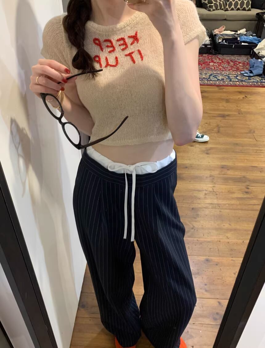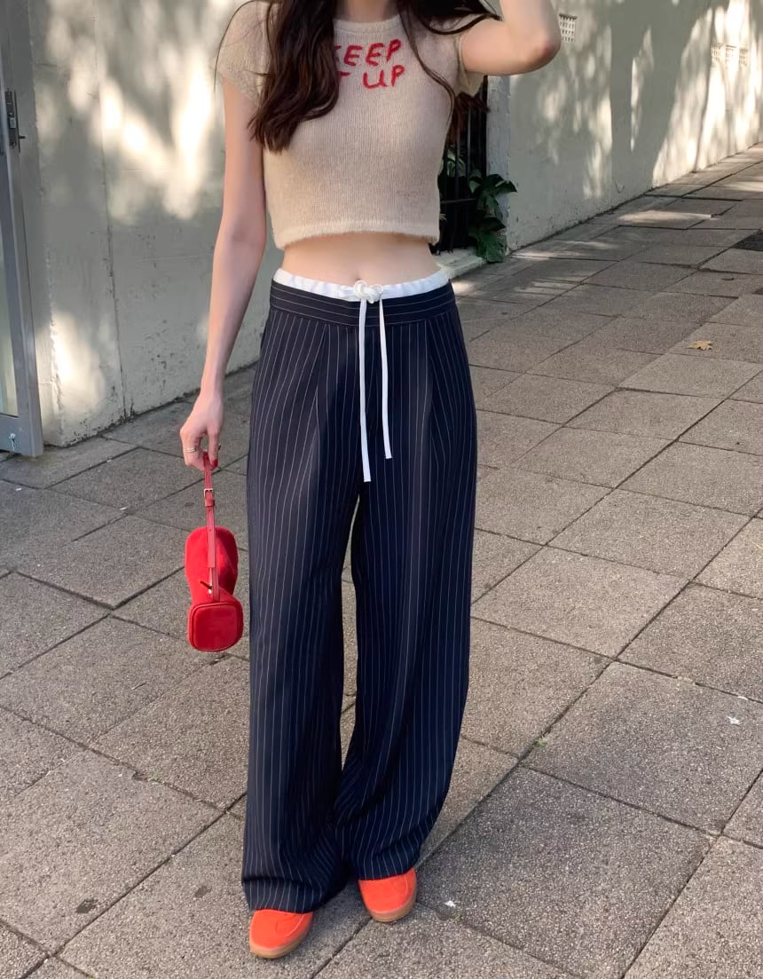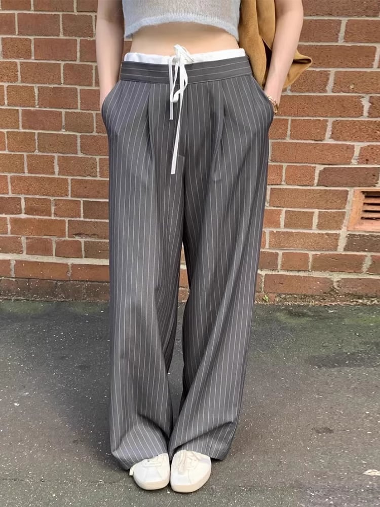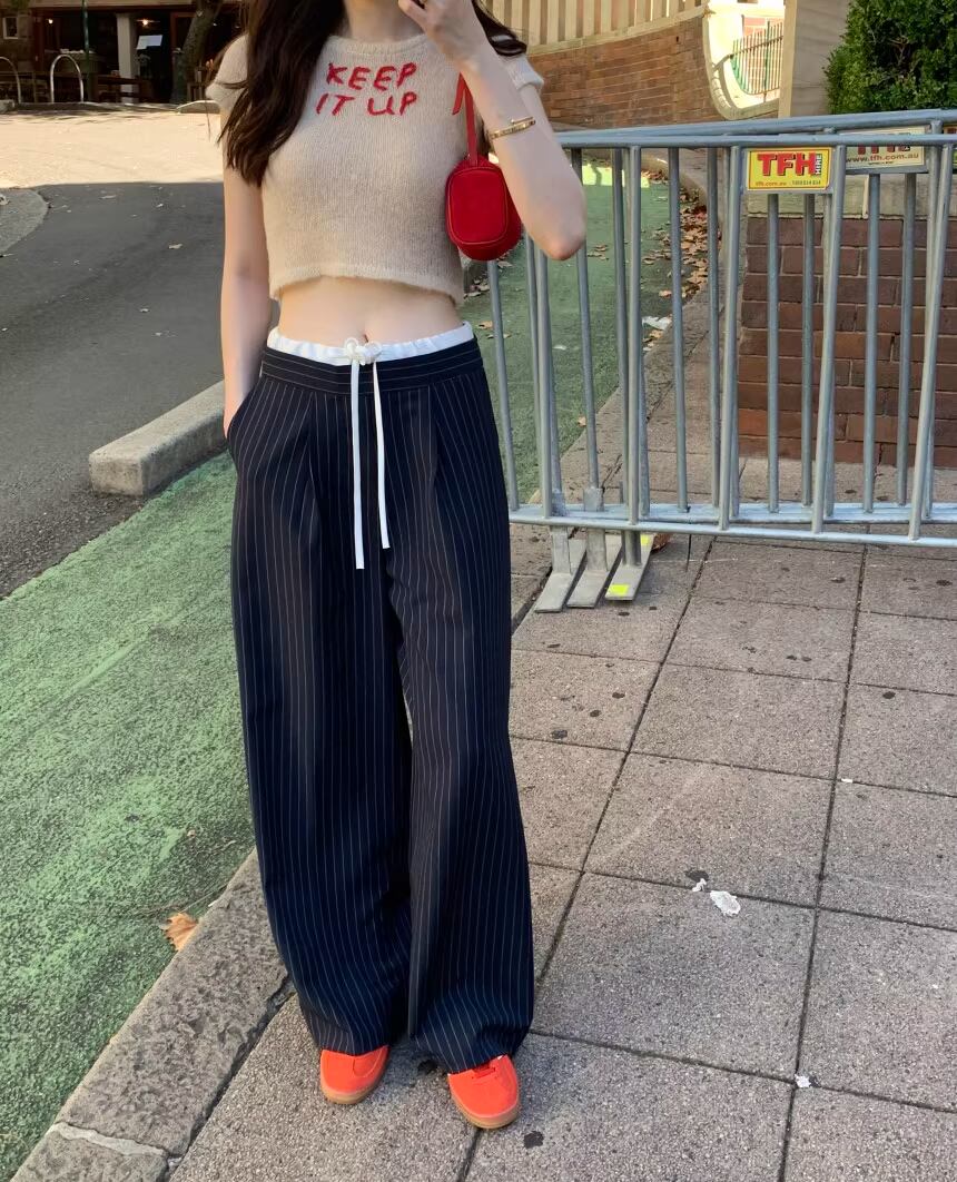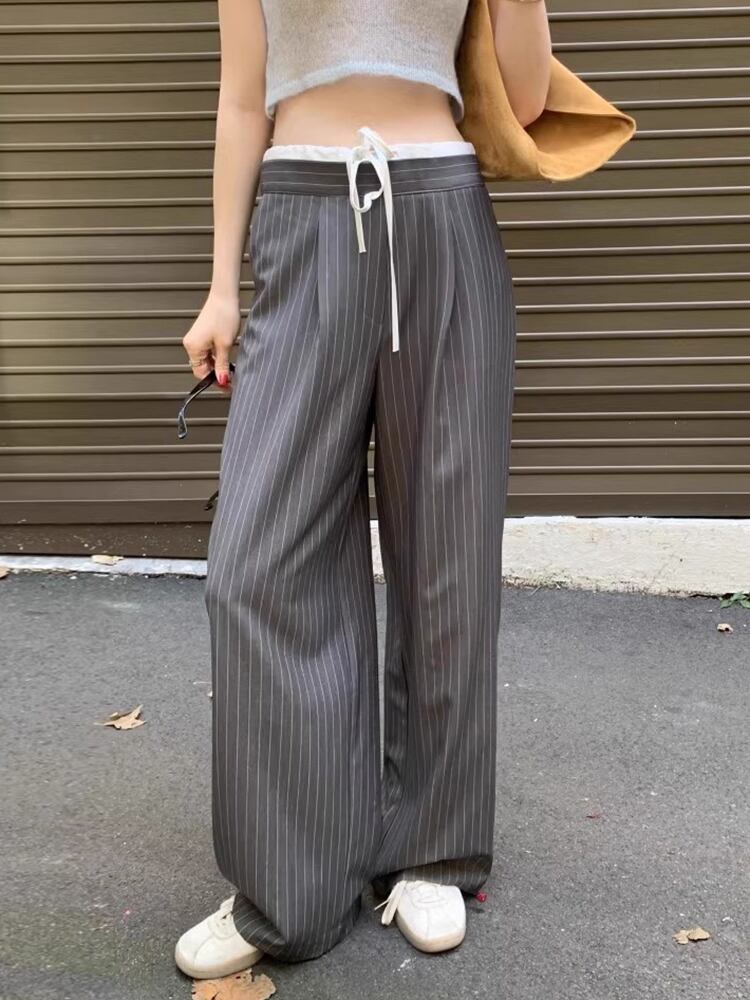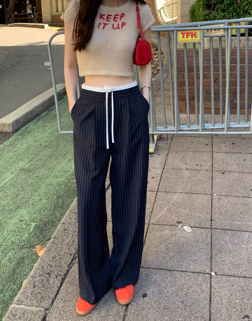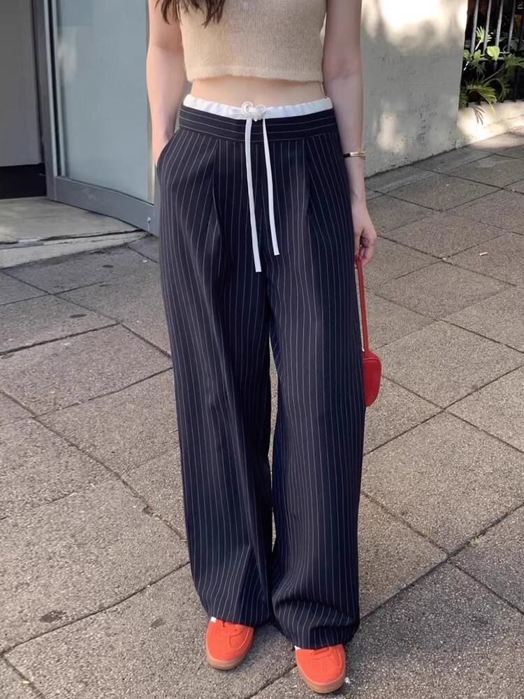 レディース パンツ ボトムス ズボン スラックス フルレングス ストレート 切り替えデザイン 重ね着風 きれいめ シンプル カジュアル 上品 おしゃれ かっこいい こなれ感 ラフ メンズライク マニッシュ ボーイッシュ ルーズ 個性的 クール モード系 主役級 抜け感 かっちり 都会的 リラックス 軽やか セクシー 色気 シック アンニュイ ストライプ 春 夏 秋 学生 通学 デート お出かけ イベント リゾート 旅行 海 プール レストラン ビーチ 公園 女子会 休日 バカンス ホテル ショッピング 発