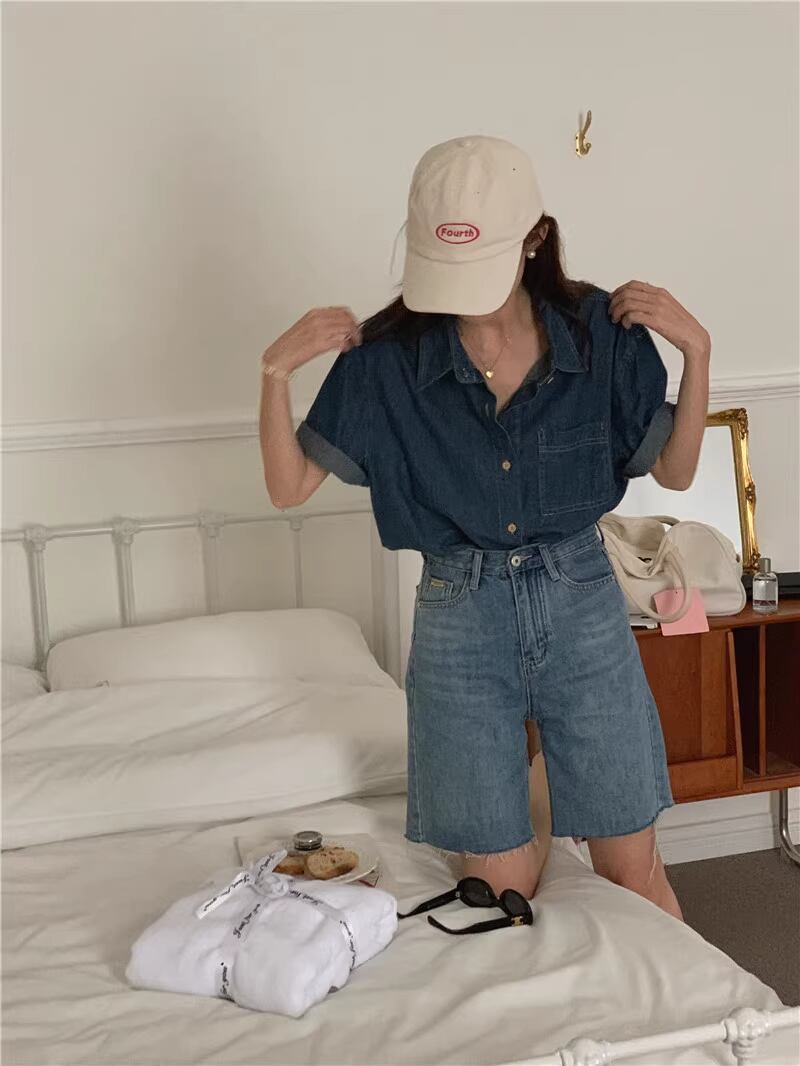 フェミニンな角襟と前開きデザインが魅力的で、すっきりとしたシルエットを演出します。実用的なポケット付きで、カジュアルにもきれいめにも着回せる一枚です。爽やかなブルーデニムは、どんなスタイルにも合わせやすく、涼しげな印象を与えます。